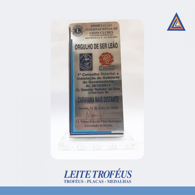 Placa em aço inox, dobrada, aplicada em base de acrílico